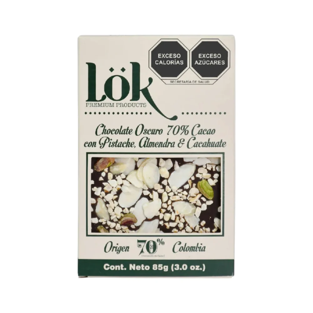 Disfruta de un delicioso chocolate oscuro con trozos de pistache, almendra y cacahuate con un cacao del 70%. Se elabora con ingredientes naturales y sin conservadores artificiales. Es perfecto para satisfacer tu antojo de dulce con un toque crujiente y un sabor intenso.