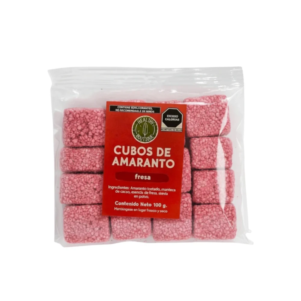 Deléitate con nuestros Cubos de Amaranto Fresa, una deliciosa combinación de amaranto tostado y el dulce aroma de fresa natural. Un snack 100% mexicano, lleno de sabor y nutrición, perfecto para disfrutar en cualquier momento del día.