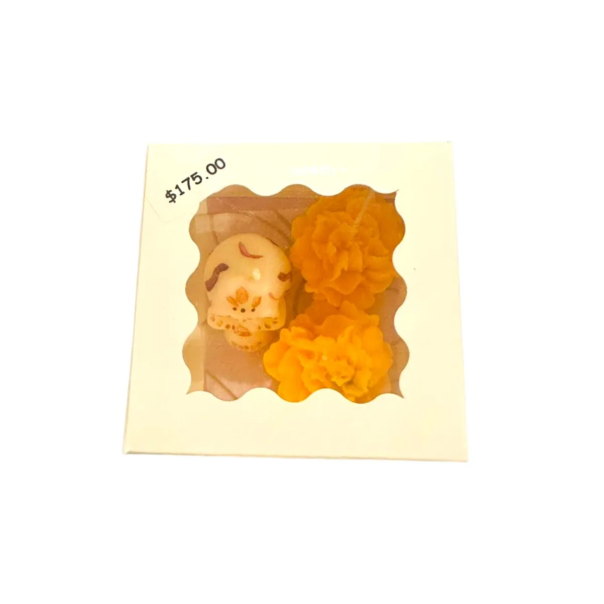 Vela Kit Flor, Pan y Calaverita: kit temático para Día de Muertos que incluye vela decorativa junto con flor, pan y calaverita. Perfecto para crear tu ofrenda o decorar tu hogar con tradición y color durante estas fechas especiales.